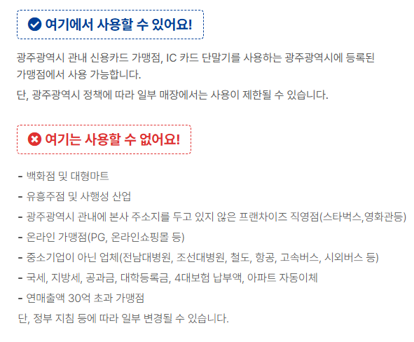 제한업소 대형백화점, 대형마트, 프랜차이즈 직영점, 주소가 광주가 아닌 사업장, 중소기업이 아닌 사업장, 연매출액 30억 초과 가맹점 등 * 사용 불가 매장은 정부 지침 등에 따라 일부 변경될