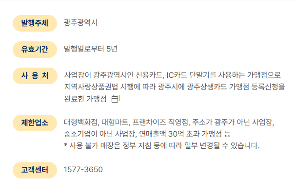 또한 광주 지역에 본사가 없는 프랜차이즈 직영점, 온라인 쇼핑몰, 세금 납부, 공과금 납부, 연매출 30억 원 초과 가맹점에서도 사용을 제한합니다.